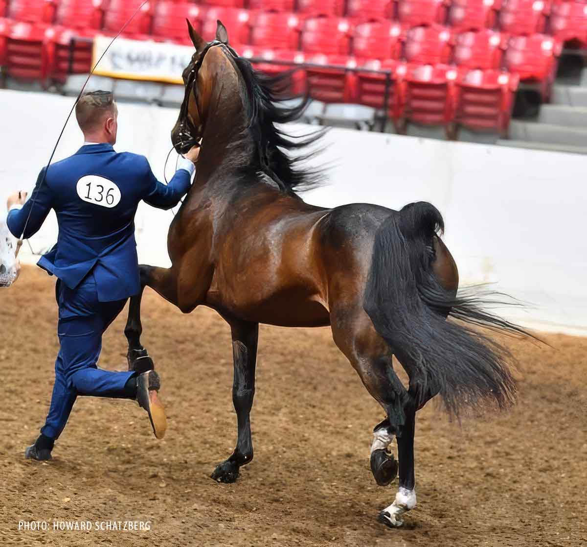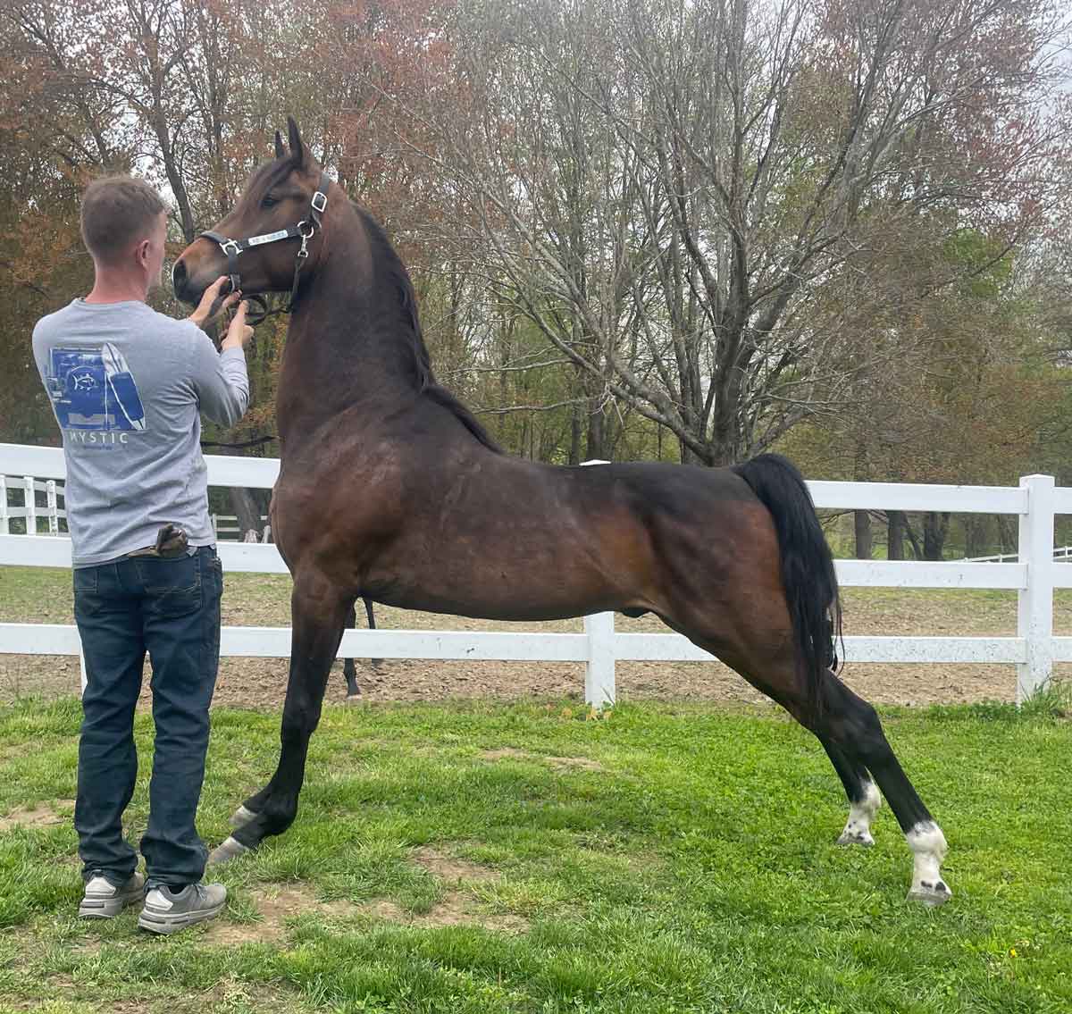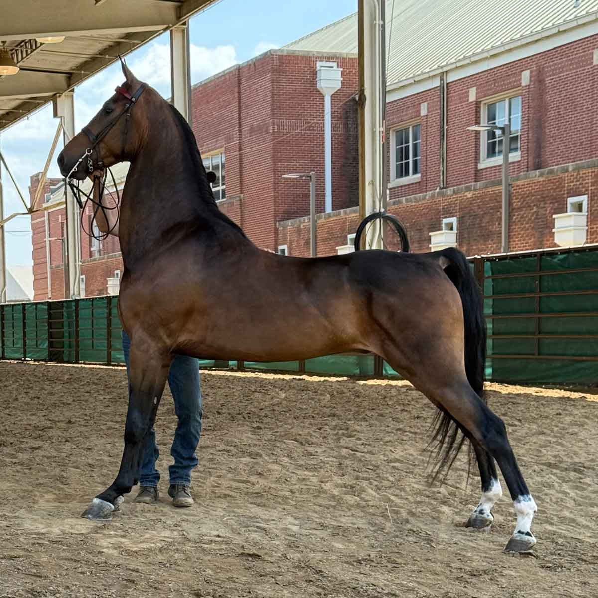 - Bay, elongated crescent star, snip, both hind fetlocks